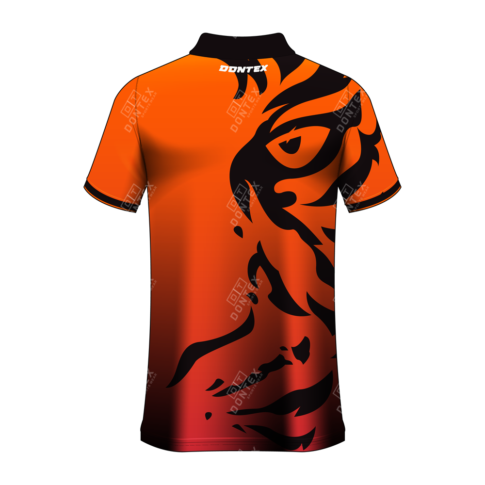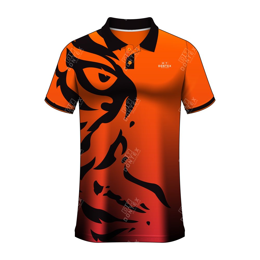 Unleash your competitive edge with the Dontex 2 Button Short Sleeve Sublimated Apex Predator Performance Polo, a high-impact garment engineered for those who lead the pack. This elite polo combines a fierce, predatory aesthetic with advanced technical fabric, making it the premier choice for professional sports teams and bold corporate identities. Featuring a vivid Sunset Orange and Crimson Red gradient with an oversized, stylized “Tiger Eye” graphic, this shirt ensures you command attention on and off the field. Whether you are driving for the goal or representing your brand at a major event, this Dontex polo provides the ultimate combination of aggressive style and breathable performance.