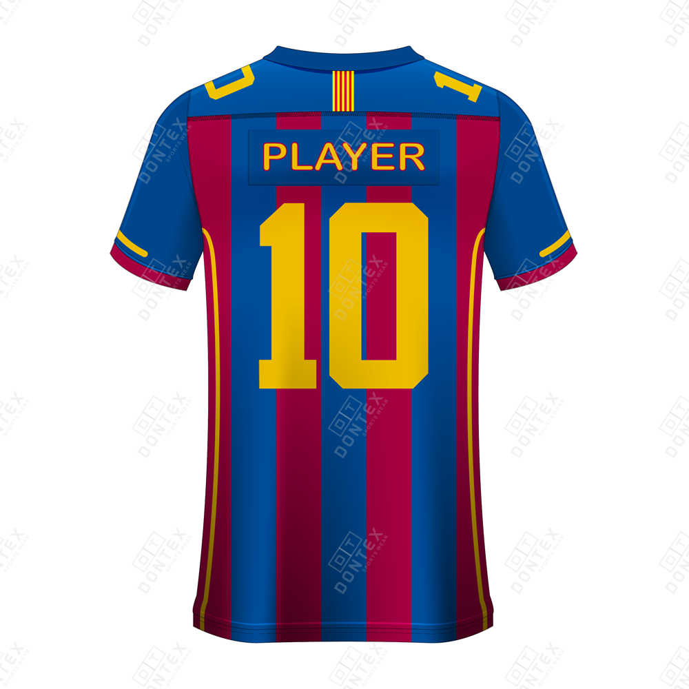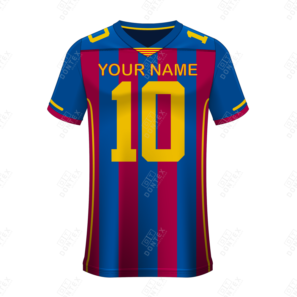 Blaugrana-Gradient Sublimation: Showcases a traditional deep blue and crimson vertical stripe pattern with high-visibility yellow numbering and “YOUR NAME” branding permanently fused into the fabric for a fade-resistant finish.