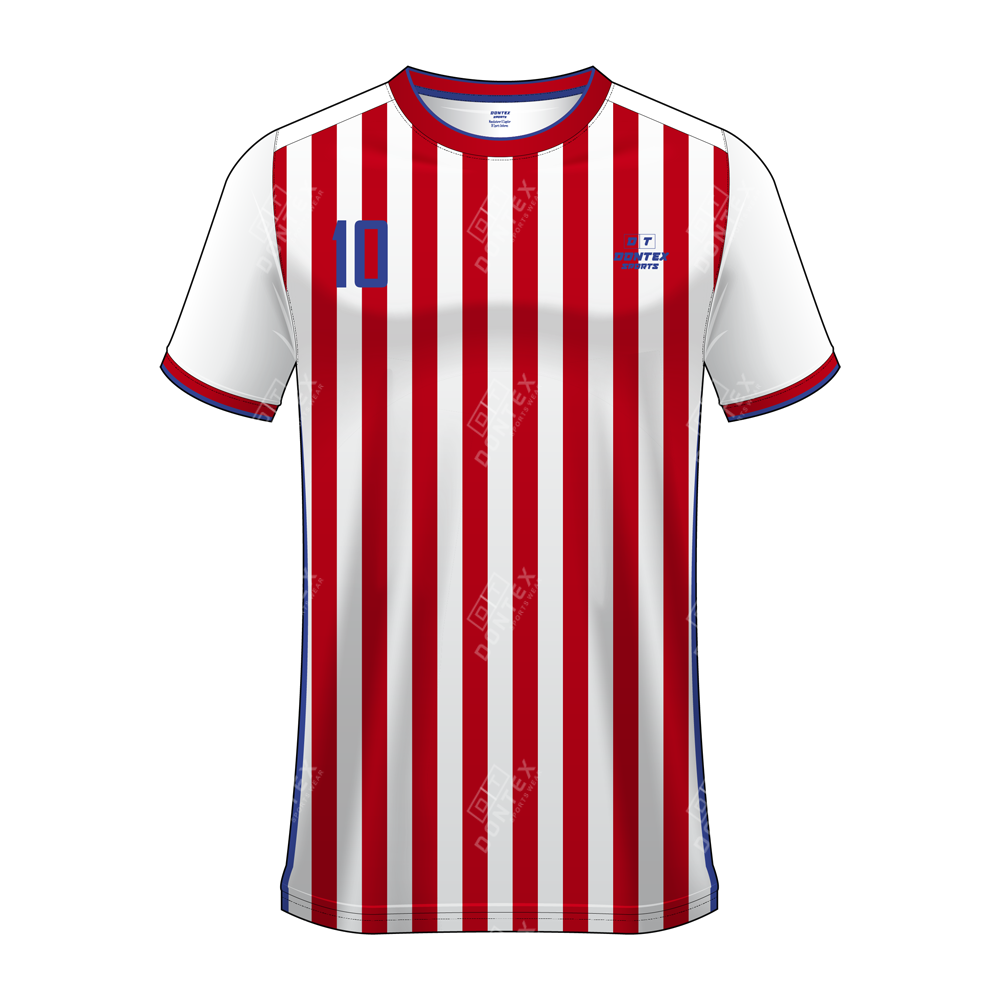The Dontex Classic-Stripe Pro-Athletic Premier Sublimated Team Soccer Jersey represents a peak in athletic engineering, combining a crisp white chassis with bold scarlet vertical bars and High Quality 100% Polyester Interlock Fabric. This specialized kit is built to optimize thermal regulation and provide an adaptive, body-mapped fit that minimizes air resistance for top-tier performance on the pitch.