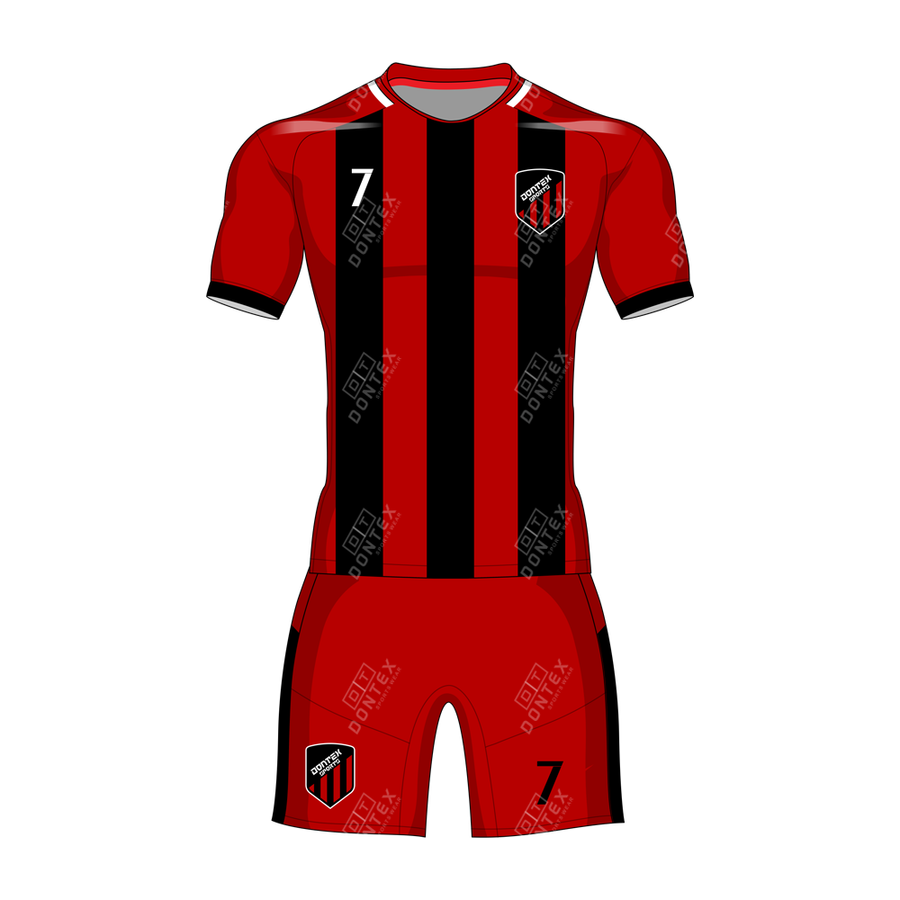 The Dontex Crimson-Stripe Pro-Athletic Premier Sublimated Soccer Uniform represents a peak in athletic engineering, combining a bold scarlet base with high-contrast vertical obsidian bars and High Quality 100% Polyester Interlock Fabric. This specialized kit is built to optimize thermal regulation and provide an adaptive, body-mapped fit that minimizes air resistance for top-tier performance on the pitch.