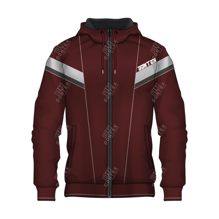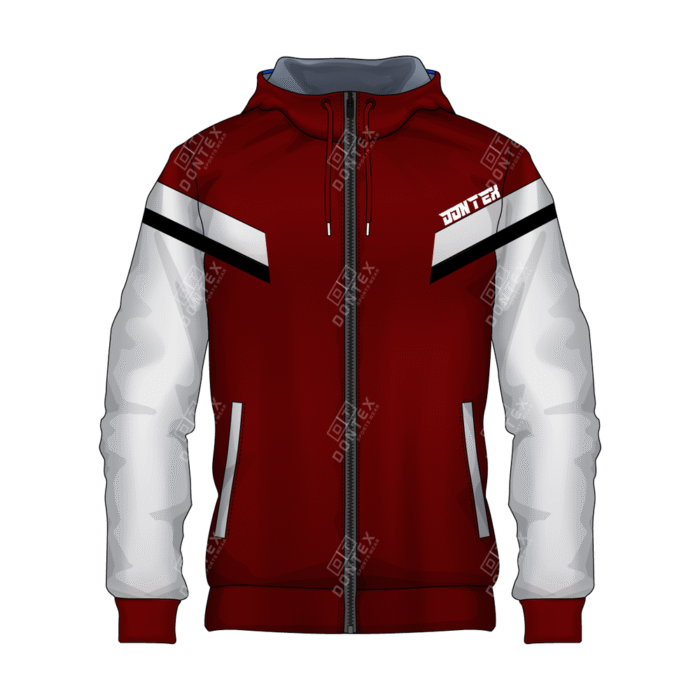 The Dontex Crimson-Titan Full-Zip Fleece Hoodie is a masterclass in athletic insulation, featuring a deep burgundy-red base accented by high-contrast white sleeves and sharp black chevron detailing. This professional training garment is constructed from High-Quality Cotton/Polyester Fleece Fabric, engineered to provide maximum thermal efficiency and a structured athletic profile for intense outdoor or gym conditioning.