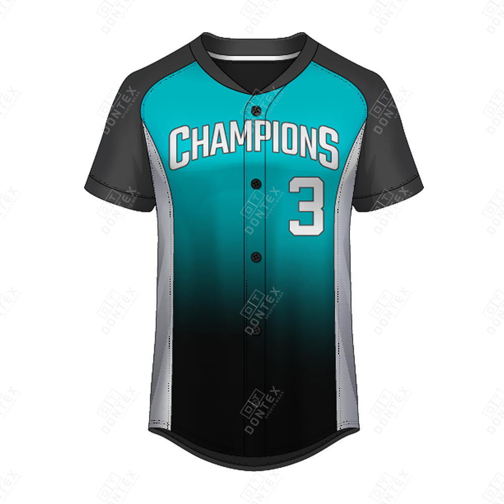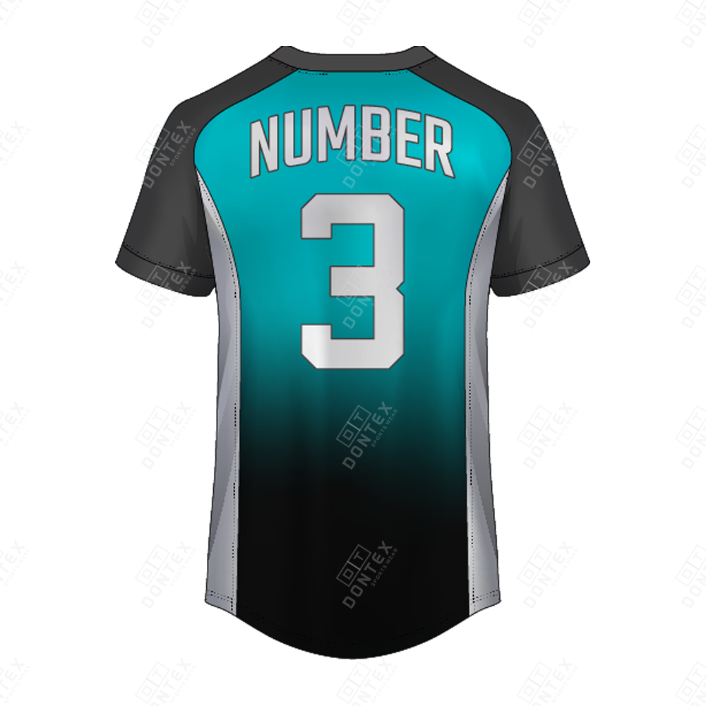 The Dontex Full Button Textured Baseball Jersey is a technical masterpiece designed for professional athletes, featuring a striking cyan-to-black gradient base, high-contrast grey side panels, and High Quality 100% Polyester Fabric. This elite baseball jersey is engineered with a focus on maximum moisture-wicking efficiency and a performance-driven anatomical fit that provides a streamlined profile for maximum agility and speed on the diamond.