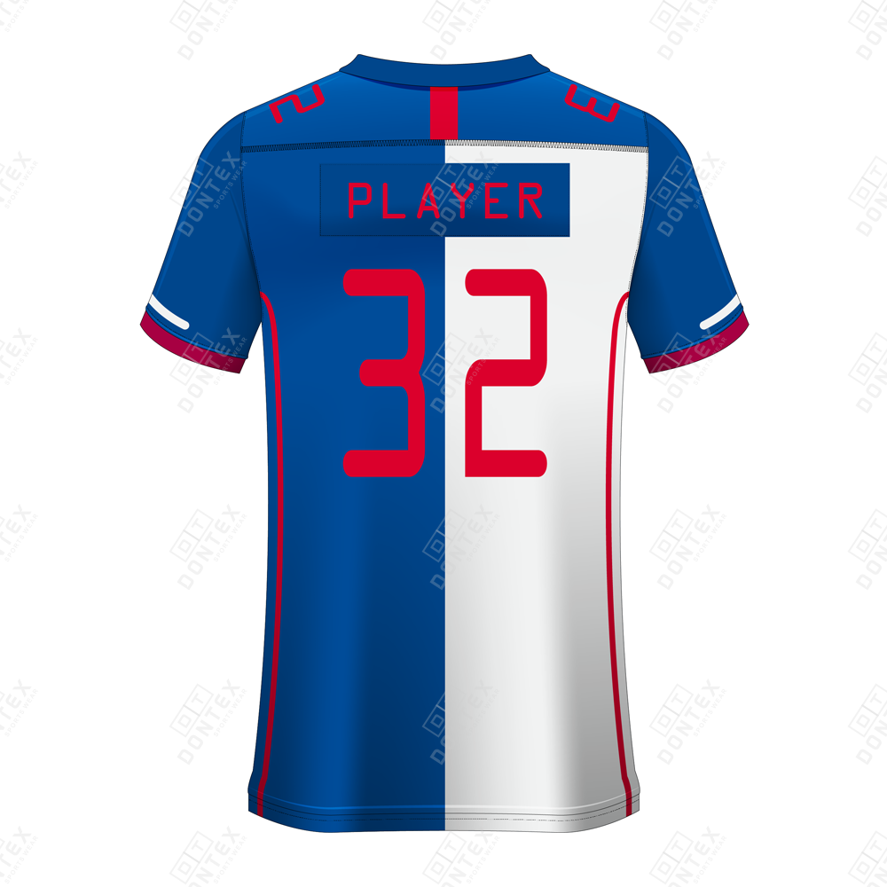 Horizon-Split Sublimation: Showcases a bold asymmetrical design with a crisp white left panel and a deep royal blue right panel, accented by high-visibility crimson numbering and “YOUR NAME” branding permanently fused into the fabric for a fade-resistant finish.