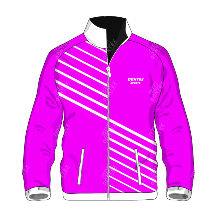 The Dontex Magenta-Prism Sports Track Jackets are a vibrant and high-impact addition to the technical sportswear line, featuring a luminous magenta body defined by sharp, diagonal white prism stripes. This specialized garment is expertly constructed from High-Quality 100% Polyester Fabric, emphasizing exceptional color retention and a refined athletic fit for competitors who require a bold aesthetic during high-intensity training.