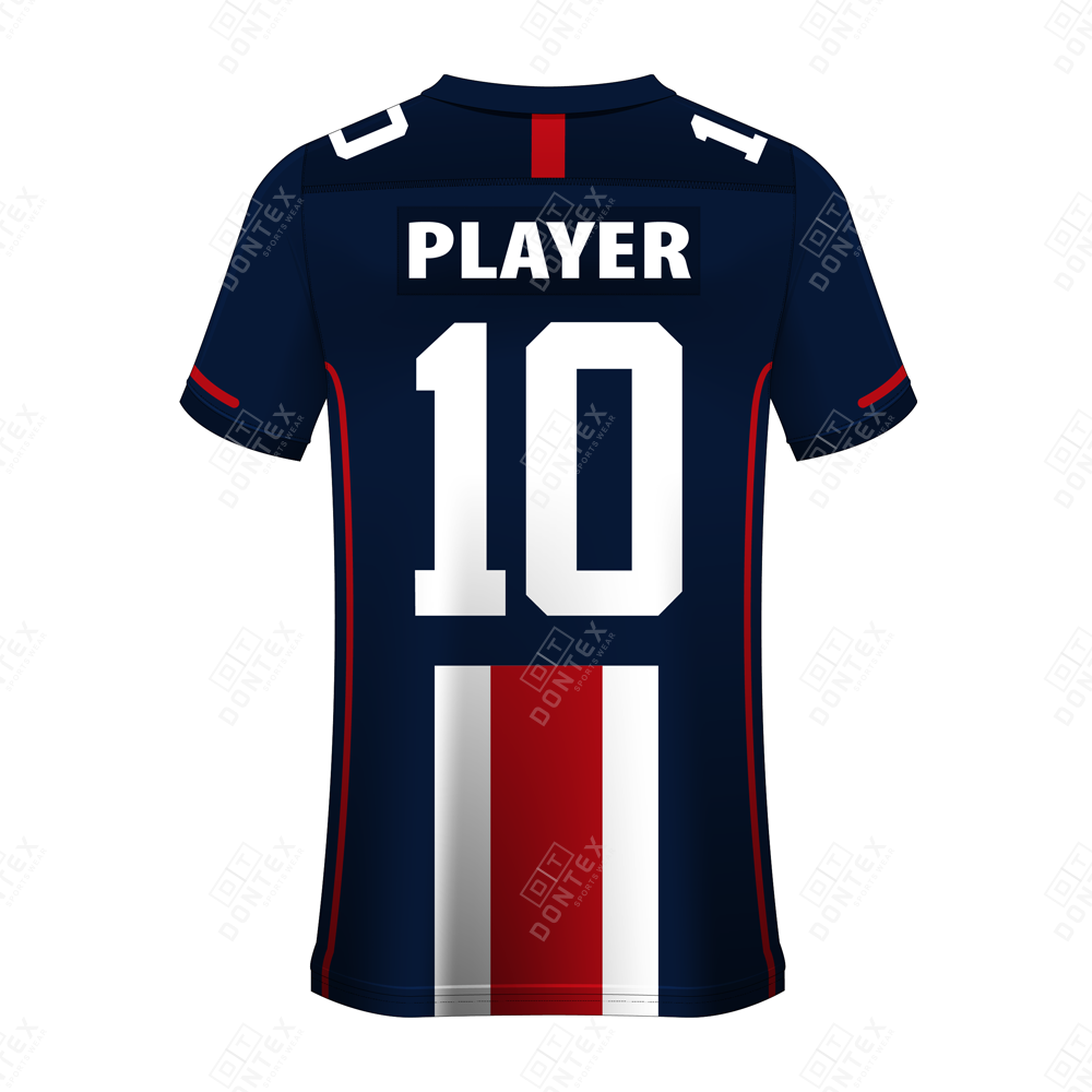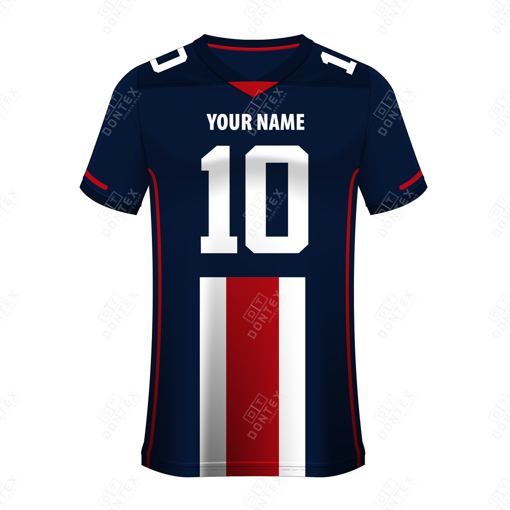 The Dontex Navy-Patriot Pro Football Jersey is a high-performance athletic garment designed for elite competition. Built from High Quality 100% Polyester Fabric, this jersey combines a classic deep navy aesthetic with bold red and white patriotic accents to keep athletes performing at their peak.