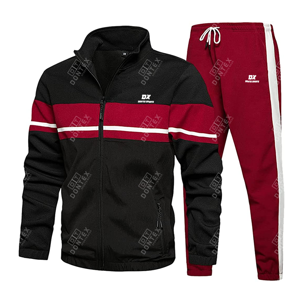 The Dontex Tri-Tone Horizon Full-Zip Collared Tracksuit is a professional-grade athletic ensemble engineered for high-intensity training and streamlined team representation. Featuring a bold tri-tone design with a black textured body, a striking crimson horizontal chest band, and white piping accents, this two-piece set is constructed from High-Quality Performance Textiles, providing a modern silhouette and superior functional movement for elite athletes and coaching staff.